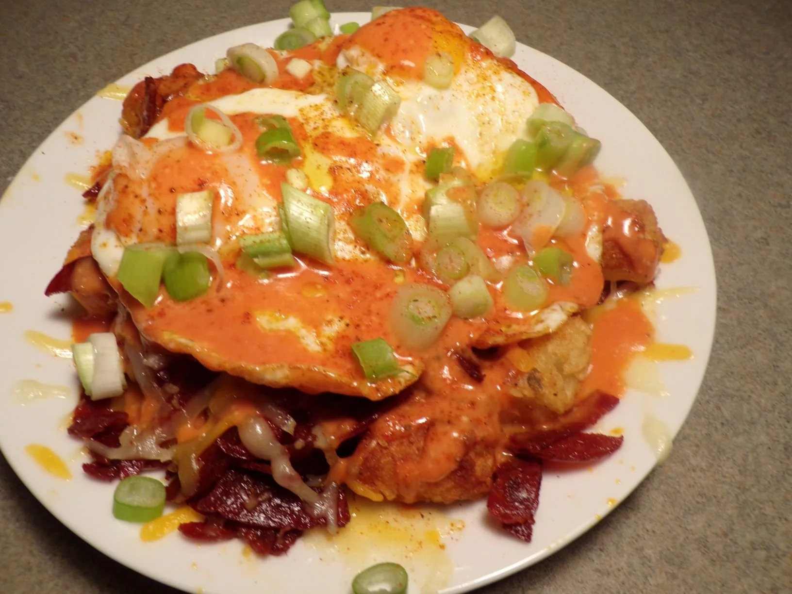Image: Serving plate containing common breakfast items like eggs and tater tots, garnished with green onions and hot sauce.