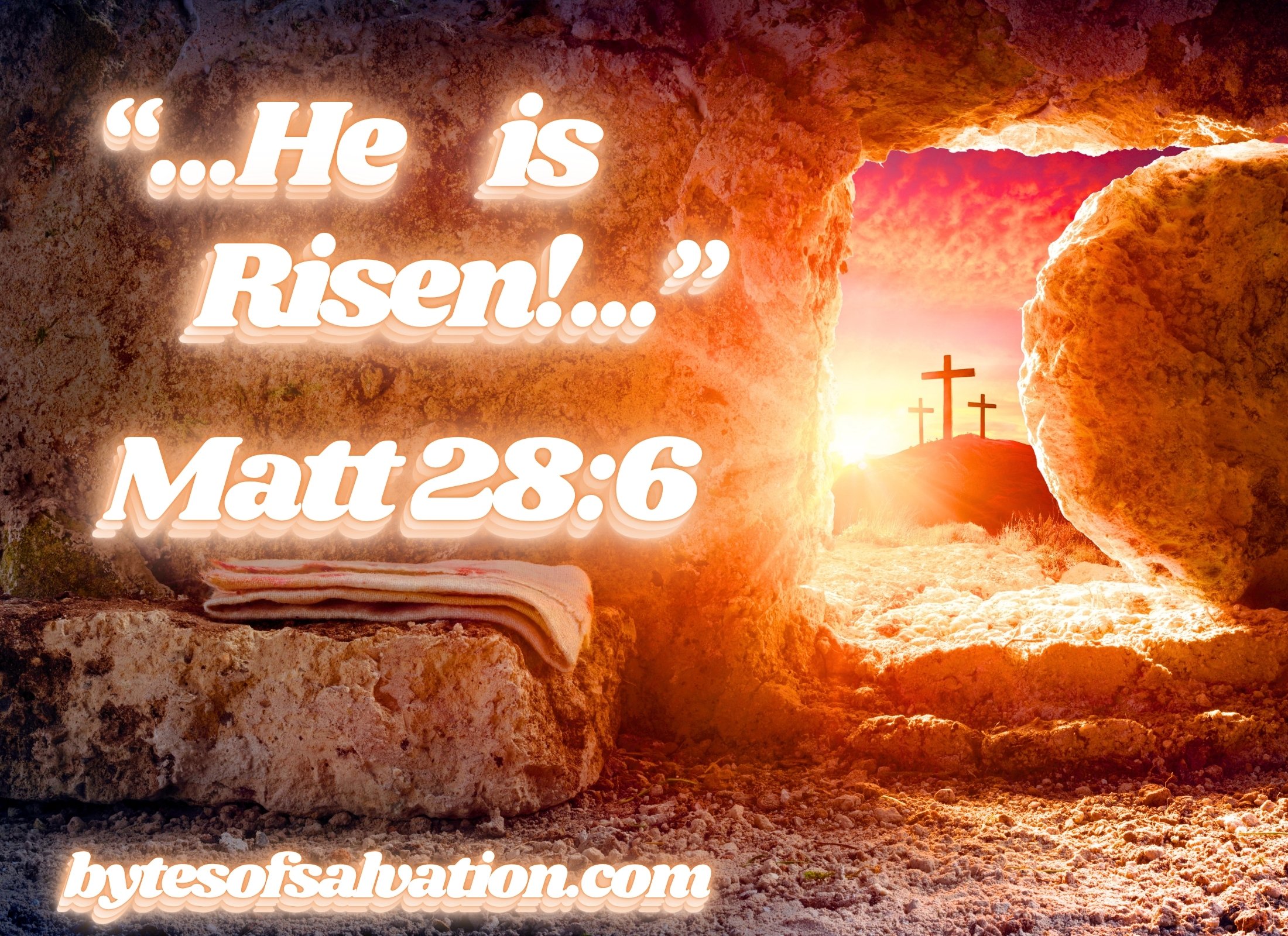 Image: Image of the empty tomb of Christ with the large stone rolled away, visual of the cross, and the sun shining into the tomb. The words "He is risen", are shown with the scripture reference Matthew 28:6 and the website name "bytesofsalvation.com" shown in the bottom left corner.